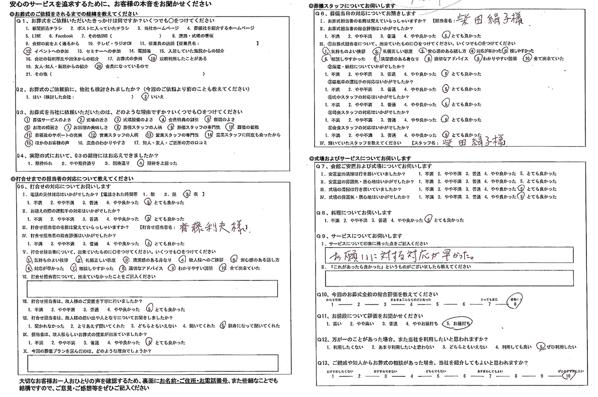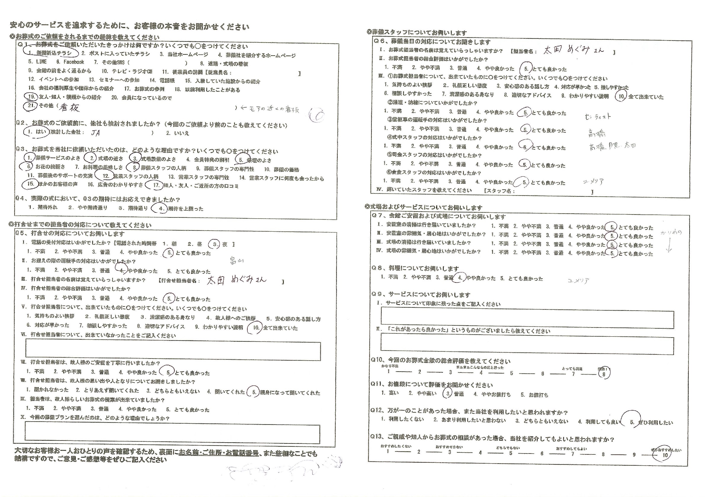 仏事に関してわからないこともたくさんある中、担当の目黒様には一つ一つ丁寧に教えていただき感謝の中、過ごすことができました。何より目黒様には笑顔と親しみやすいお人柄に助けられました。 -