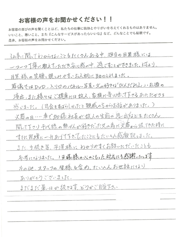 仏事に関してわからないこともたくさんある中、担当の目黒様には一つ一つ丁寧に教えていただき感謝の中、過ごすことができました。何より目黒様には笑顔と親しみやすいお人柄に助けられました。