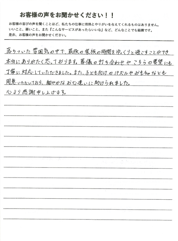 落ち着いた雰囲気の中で、最後の家族の時間をゆっくりと過ごすことができ本当にありがたく思っております。 葬儀の打ち合わせやこちらの要望にも丁寧に対応していただきました。また子ども向けのパズルやおもちゃなども用意いただいており、細やかなお心遣いに助けられました。心より感謝申し上げます。 -