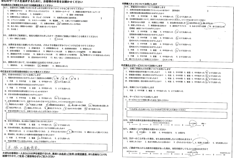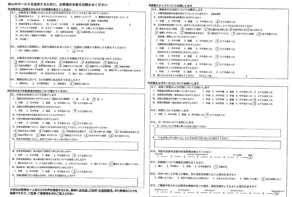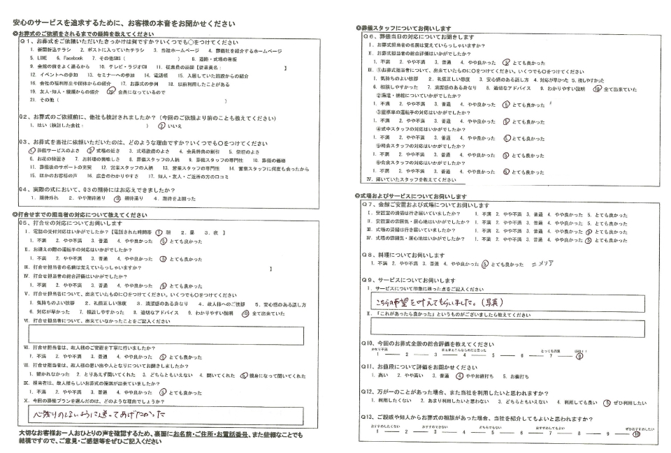 私事ではありますが、ここ12年間で5回もメモリーさんを使わせていただき本当にありがたく思っております。 担当者は毎回ちがっていましたが、誰一人として親切ですばらしい対応でありました。 -