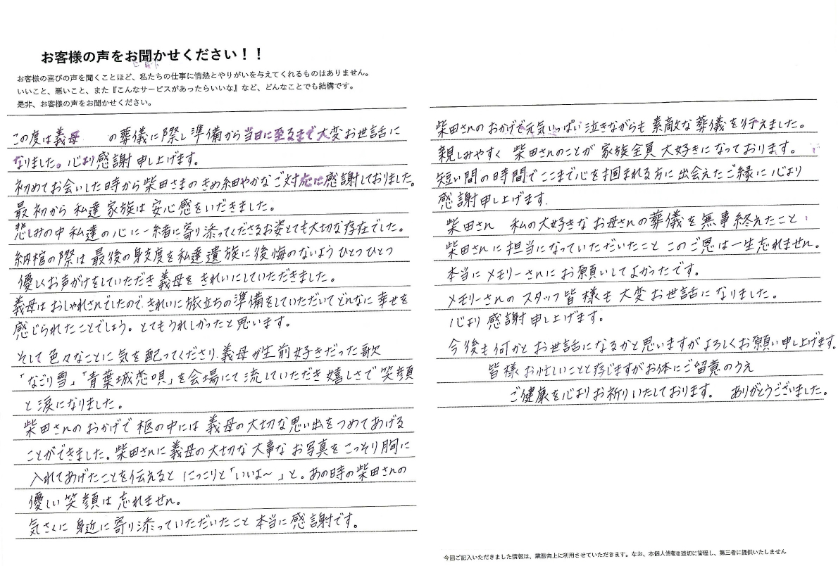 今回の葬儀は誰にも知らせず、行ったので参列者はいないと思っていたら、施設の方々が参列して下さりました。 事前に打合で返礼品の準備をしていたかげであわてず対応でき感謝しています。 私事ではありますが、ここ12年間で5回もメモリーさんを使わせていただき本当にありがたく思っております。 担当者は毎回ちがっていましたが、誰一人として親切ですばらしい対応でありました。 心よりお礼申し上げます。 -