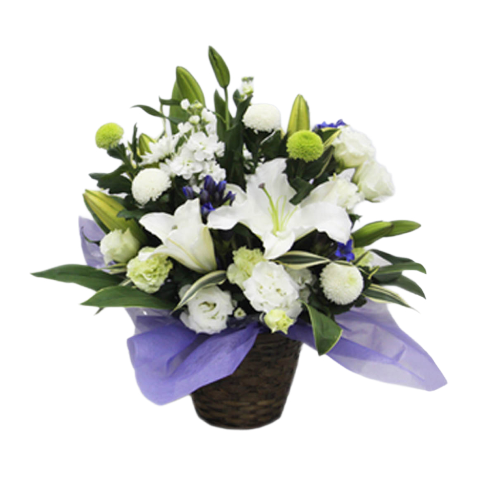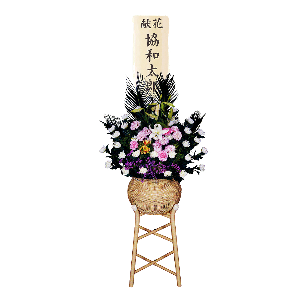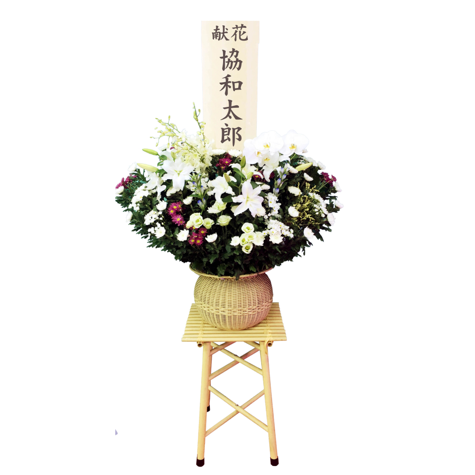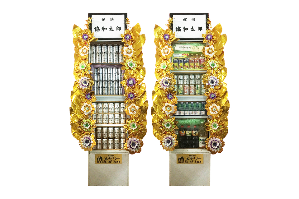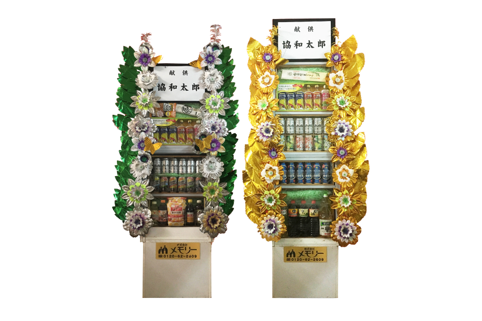 メモリーが大仙市・秋田市向けに用意した白と薄紫の二段スタンド供花
