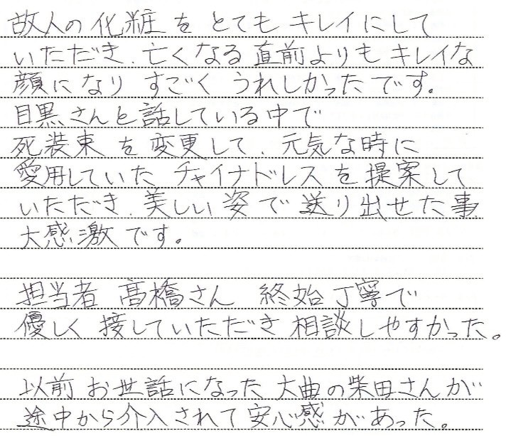 - 故人の化粧をとてもキレイにしていただき、亡くなる直前よりもキレイな顔になり、すごく うれしかったです。目黒さんと話している中で 死装束を変更して、元気な時に愛用していたチャイナドレスを提案していただき、美しい姿で送り出せた事、大感激です。